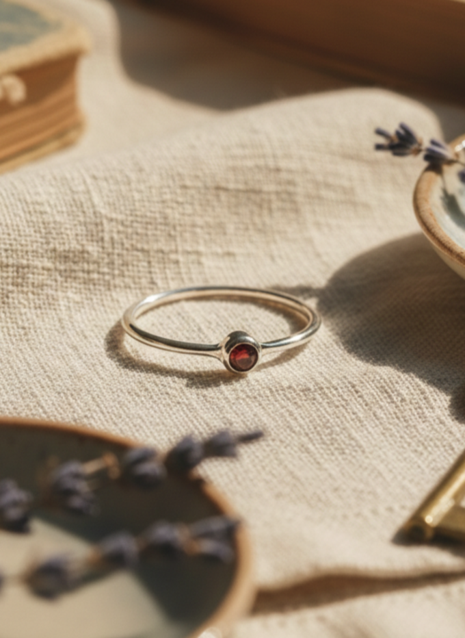 Ein eleganter Ring mit einem tiefroten runden und geschliffenen Granatstein. Keala ist ein eleganter Klassiker, der sowohl einzeln als auch in Kombination mit anderen Ringen schön aussieht. Seit der Antike wird roter Granat mit Herz, Liebe, Leidenschaft und Wärme in Verbindung gebracht.
