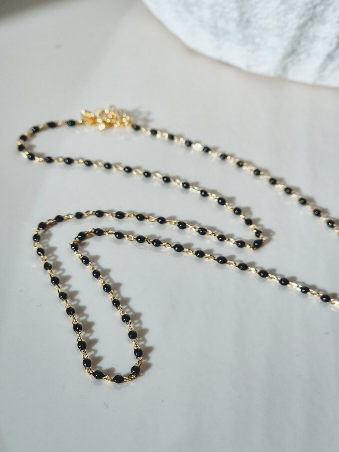 Dunkel, glänzend und voller Klasse. Die Minuit-Perlenkette besteht aus runden Perlen aus tiefschwarzer Emaille mit hochglänzendem Finish.
