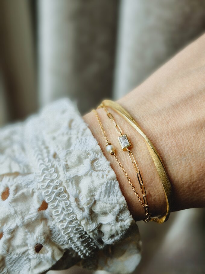 Zart, feminin und klassisch mit modernem Twist. Ein feines Gliederarmband mit einer einzelnen runden Süßwasserperle in der Mitte. Die Kombination aus dem filigranen Design und dem sanften Schimmer der Perle macht dieses Schmuckstück zu einer eleganten Ergänzung für jeden Look. Das Armband ist größenverstellbar und schmiegt sich angenehm an.