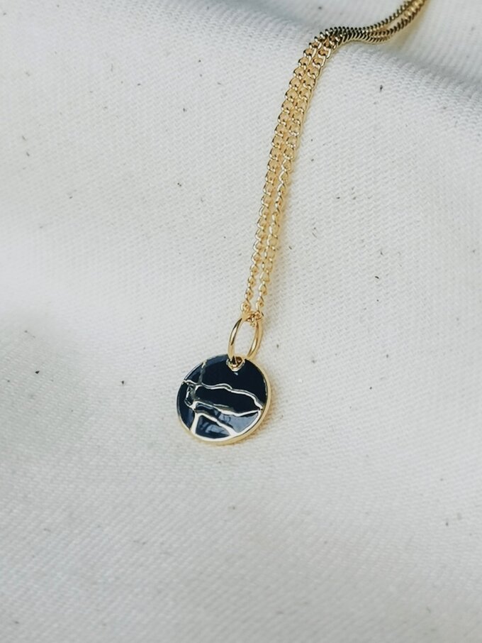 A minimalist and elegantly detailed pendant inlaid with deep blue enamel and decorated with gold plated kintsugi lines. 'Kintsugi' literally means 'golden repair', and is the Japanese art in which broken ceramics are restored with gold colored lacquer. The beautiful, accentuated fracture marks represent the philosophy that celebrates the beauty of transience and imperfections.