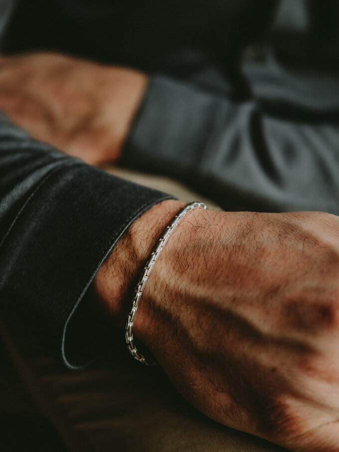 A modern link bracelet with a clean, rounded profile. The elongated, rounded links interlock fluidly. Polished silver adds a refined, stylish shine. A timeless basic with technical precision that pairs effortlessly. The perfect bracelet for every day.
