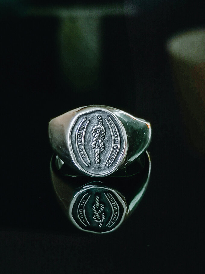 Inspired by classic signet rings yet designed with an original twist. On the heavily oxidized front of this ring you find the Latin inscription: ‘Aut viam inveniam, aut faciam’, meaning ‘I shall either find a way, or create one’. The tilted and knotted infinity symbol stands for the determination to never stop trying to do so, for it is a way of life.