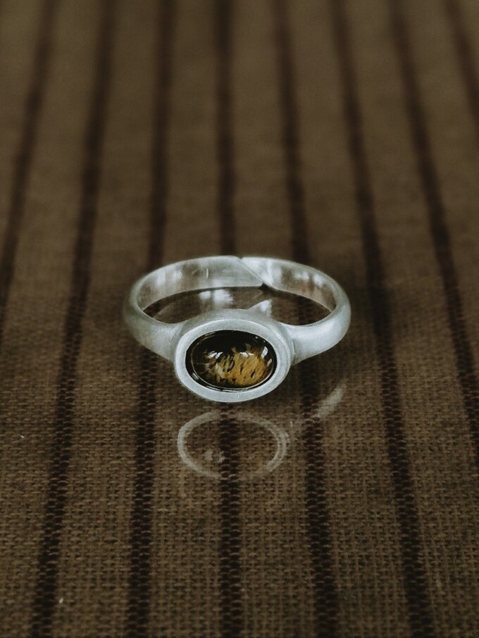 Chaleureuse, terreuse et pleine de caractère. La bague Zephyr à œil de tigre brun associe un anneau en argent mat à une pierre naturelle ovale, lisse et polie. L’œil de tigre est connu pour son côté protecteur et sa couleur profonde, allant du doré au brun foncé. L’anneau ajustable assure un port confortable. Une bague type chevalière pour ceux qui aiment le design moderne.