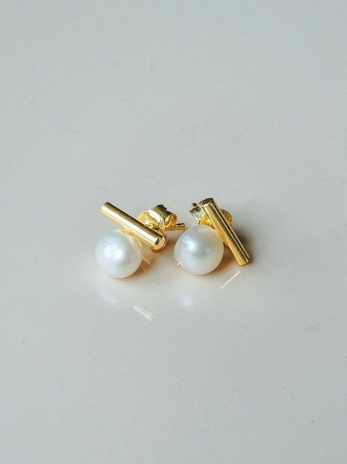 Modern en subtiel. De Ondine ear studs combineren een strak, horizontaal lijnvormig element met een ronde zoetwaterparel die er direct onder rust. Minimalistisch en perfect in balans; een paar studs dat elegant is zonder te overdrijven. Draagbaar bij elke look, van casual tot formeel. Verkocht als paar.
