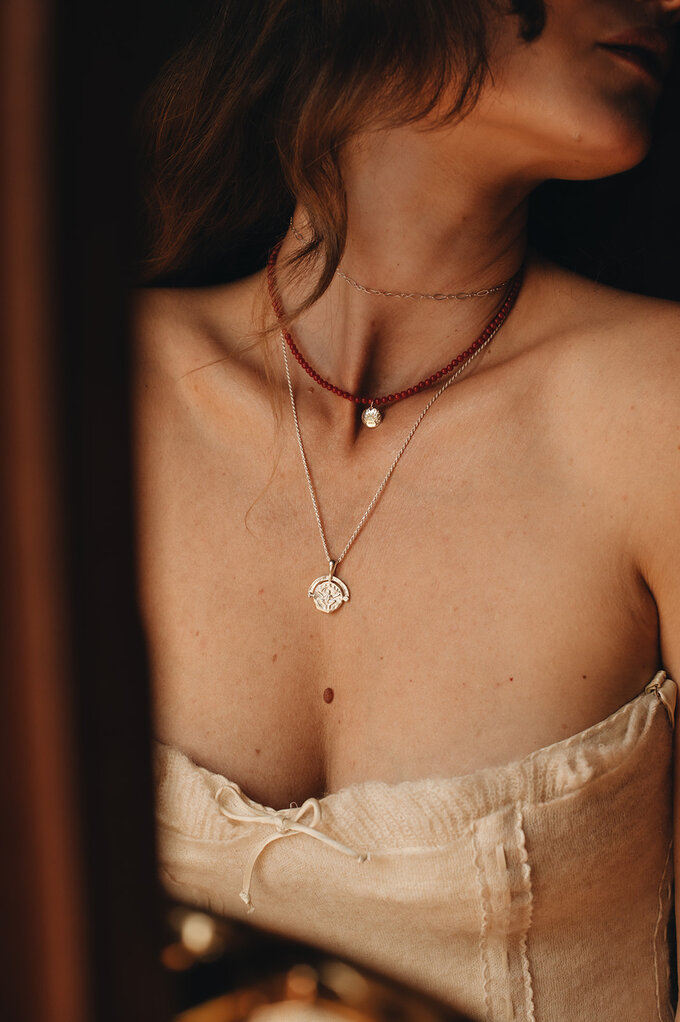 Het model op de foto draagt deze hanger in combinatie met de rode bamboekoralen ketting Electra, ketting Makana, ketting Artemis en een Element-hanger.
