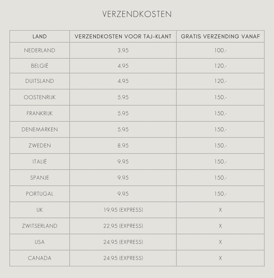 Taj is niet verantwoordelijk voor eventuele vertraging gelegen bij derden (transport/koeriersbedrijf). Heb je je pakje na bovenstaande levertijd echter nog niet binnen, mail dan naar [email protected]. Dan gaan wij erachteraan!