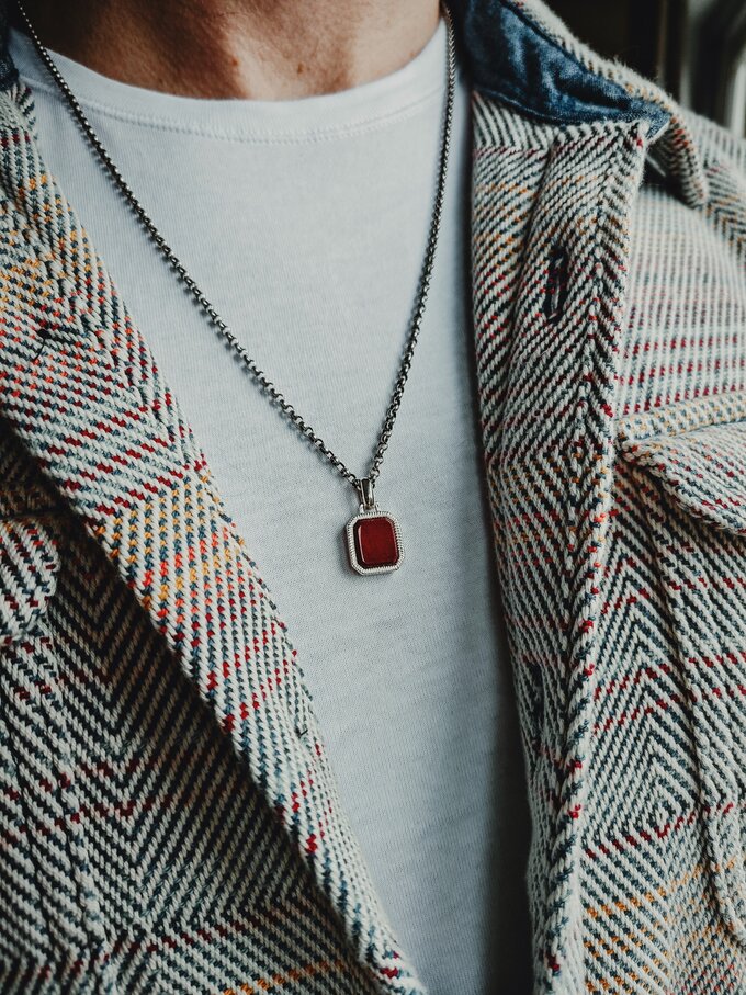 Een tijdloze essential met een krachtige uitstraling. De Chetas-hanger draagt een diepgekleurde jaspis-edelsteen, die bekend staat om zijn aardse energie en warme, diepe tinten. Jaspis is een steen die traditioneel wordt geassocieerd met moed, vastberadenheid en innerlijke stabiliteit. Een betekenisvolle steen dus, met een stijlvolle doch ingetogen uitstraling.