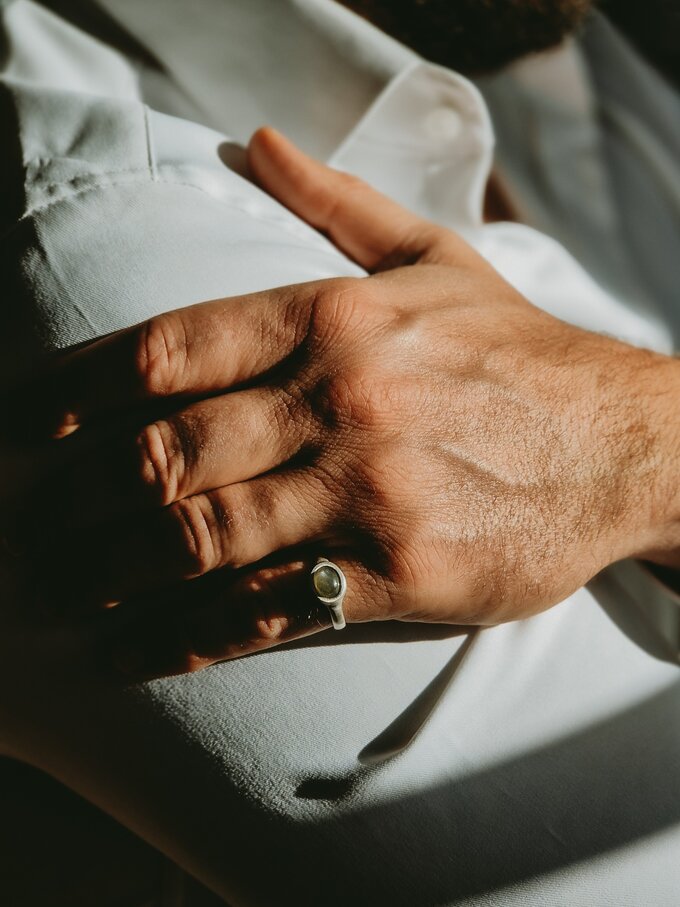 Een moderne, minimalistische ring met een matzilveren band en een gladgepolijste, ovale steen in groengrijze tinten. Labradoriet staat bekend om zijn subtiele glans en opvallende kleurenspel. Een natuursteen die symbool staat voor bescherming en intuïtie. De verstelbare maat maakt Zephyr extra comfortabel om te dragen. Een mooie basic herenring met net een beetje kleur.