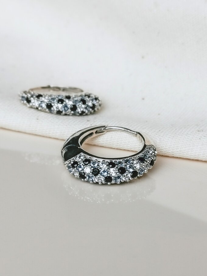 Een dromerige paar dome oorbellen ingelegd met nano-saffier, -onyx en -bergkristal steentjes. Sprankelend, stijlvol en dusdanig vormgegeven, dat de Sora-oorbellen vanuit iedere hoek subtiel het licht weten te vangen. Verkocht per paar.